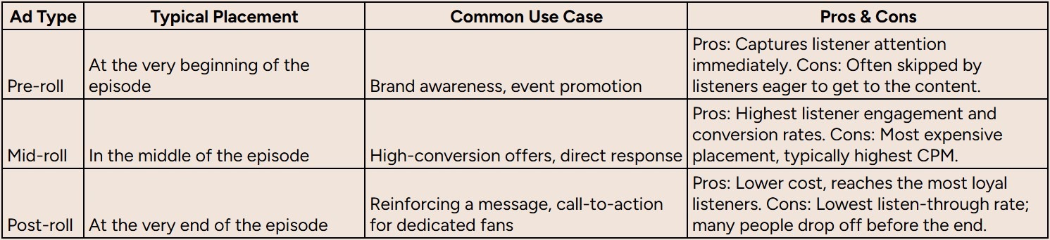 - Ad Format: A personal, host-read ad feels like a genuine recommendation and usually costs more than a pre-produced spot you provide.