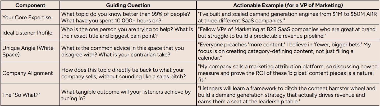 By the end of this, you should be able to articulate your niche in a single, powerful sentence. For our VP of Marketing, it might be: "My podcast helps B2B marketing leaders build predictable revenue engines through fewer, bigger content bets." Now that's a show with a purpose.