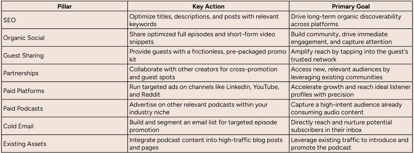 This table breaks down the core strategies we use to make sure our podcast content and all its derivatives get seen and heard by the right people, driving maximum impact.