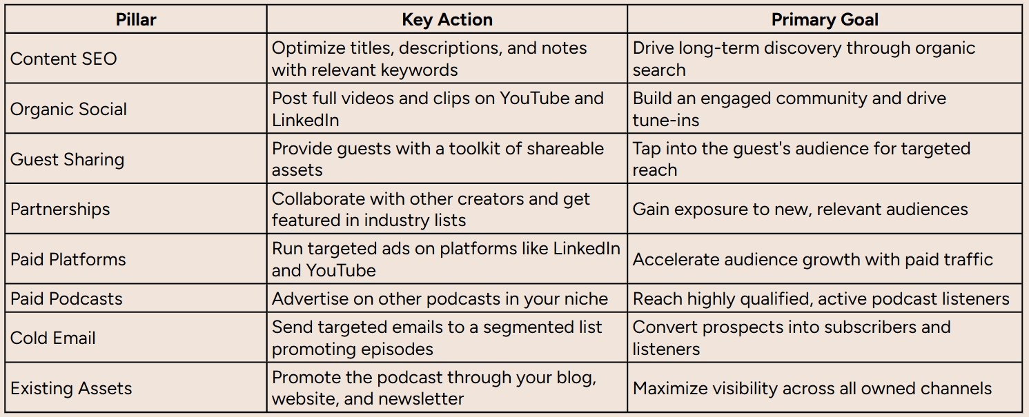 By systematically executing across these eight pillars, you move away from "publish and pray" and toward a predictable system for growth that turns your podcast into a true demand generation asset.
