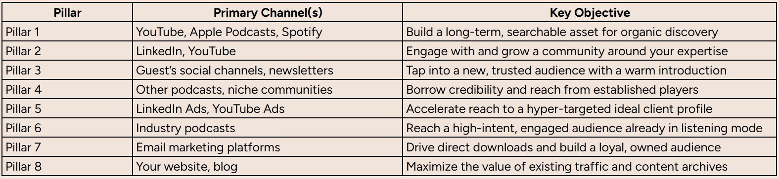 - Pillar 6: Paid Podcasts. If the budget allows, advertising on other relevant podcasts in your industry is one of the most direct ways to reach a highly engaged, high-intent audience. They’re already listening and ready to learn.