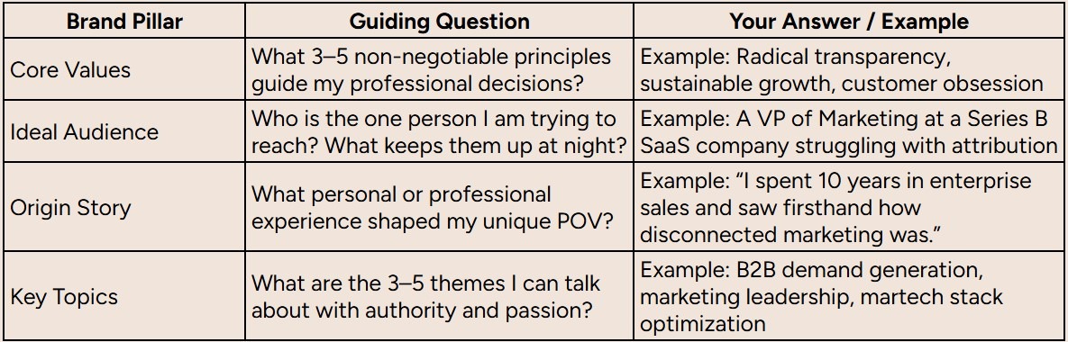 Without this groundwork, your content will feel random and disconnected. You'll end up sounding like every other leader out there, spouting generic corporate-speak that nobody remembers. We can't have that.