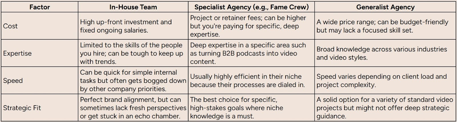 Deciding between building an in-house team, hiring a specialized agency, or going with a generalist is a big decision. This table breaks down what you can expect from each.